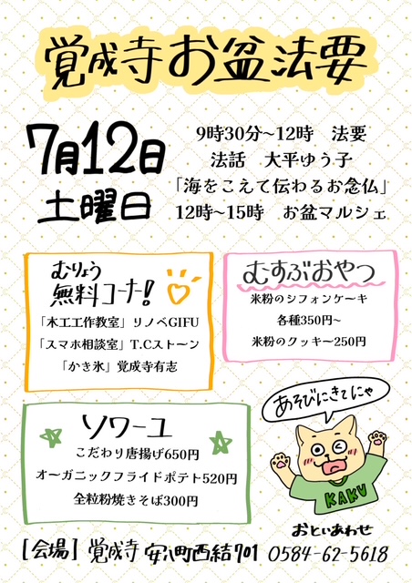 出店協力:ソワーユ(こだわり唐揚げetc)/ ムスブオヤツ(米粉のおやつ)/ T.Cストーン(スマホ相談)/ リノベGIFU(木工教室)/ 覚成寺有志(かき氷)